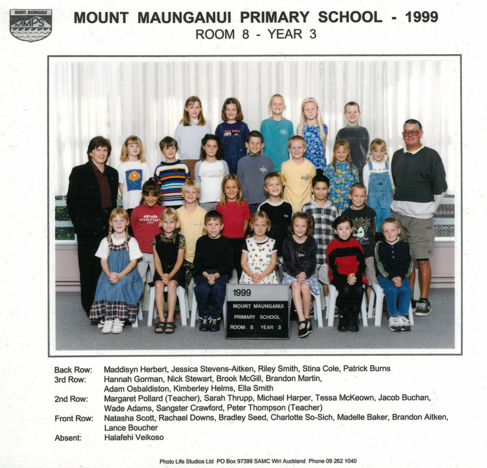 Date1999Reference NumberPhoto 13-1419DescriptionPhotograph of Mount Maunganui Primary School room 8 year 3 1999. From images collected during centenary celebrations 2013. Row 4: Maddisyn Herbert – Jessica Stevens-Aitken – Riley Smith – Stina Cole – Patrick BurnsRow 3: Hannah Gorman – Nick Stewart – Brook McGill – Brandon Martin – Adam Osbaldiston - Kimberley Helms – Ella SmithRow 2: Margaret Pollard – Sarah Thrupp – Michael Harper – Tessa McKeown – Jacob Buchan - Wade Adams – Sangster Crawford – Peter ThompsonRow 1: Natasha Scott – Rachael Downs – Bradley Seed – Charlotte So-Sich – Madelle Baker - Brandon Aitken – Lance BoucherAbsent: Halafehi VeikosoPhotograph of Mount Maunganui Primary School room 8 year 3 1999. From images collected during centenary celebrations 2013. Row 4: Maddisyn Herbert – Jessica Stevens-Aitken – Riley Smith – Stina Cole – Patrick BurnsRow 3: Hannah Gorman – Nick Stewart – Brook McGill – Brandon Martin – Adam Osbaldiston - Kimberley Helms – Ella SmithRow 2: Margaret Pollard – Sarah Thrupp – Michael Harper – Tessa McKeown – Jacob Buchan - Wade Adams – Sangster Crawford – Peter ThompsonRow 1: Natasha Scott – Rachael Downs – Bradley Seed – Charlotte So-Sich – Madelle Baker - Brandon Aitken – Lance BoucherAbsent: Halafehi VeikosoFormatPrint