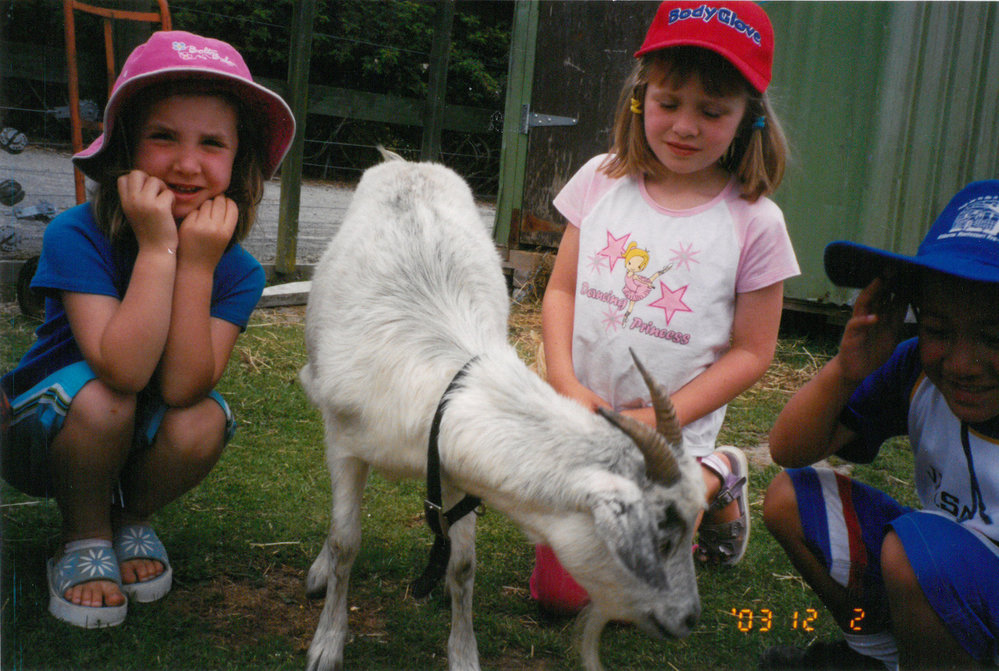 Date2003Reference NumberPhoto 13-1178DescriptionPhotograph of Mount Maunganui Primary School visit to Balligan's Farm, involving tractor rides and animal petting 2003. Jasmine Scott and Louise Skousgaard with goat. From images collected during centenary celebrations 2013. FormatPrint