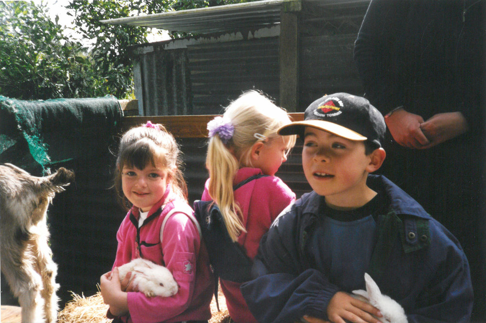 Date2003Reference NumberPhoto 13-1179DescriptionPhotograph of Mount Maunganui Primary School visit to Balligan's Farm, involving tractor rides and animal petting 2003. Nikayla Taylor and Hamish Roberts holding rabbits. From images collected during centenary celebrations 2013. FormatPrint