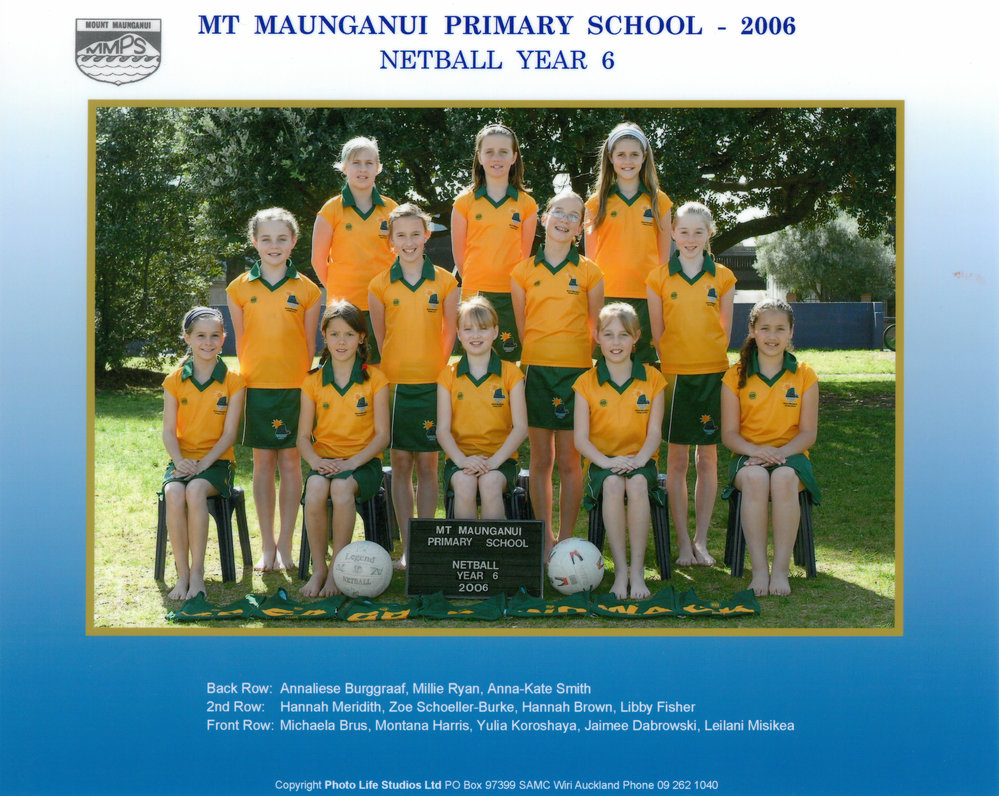 Date2006Reference NumberPhoto 13-433DescriptionPhotograph of Mount Maunganui Primary School Netball Year 6 2006. From images collected during Mount Maunganui Primary School Centenary 2013. Back Row: Annaliese Burggraaf - Millie Ryan - Anna-Kate Smith2nd Row: Hannah Meridith - Zoe Schoeller-Burke - Hannah Brown - Libby FisherFront Row: Michaela Brus - Montana Harris - Yulia Koroshaya - Jaimee Dabrowski - Leilani MisikeaPhotograph of Mount Maunganui Primary School Netball Year 6 2006. From images collected during Mount Maunganui Primary School Centenary 2013. Back Row: Annaliese Burggraaf - Millie Ryan - Anna-Kate Smith2nd Row: Hannah Meridith - Zoe Schoeller-Burke - Hannah Brown - Libby FisherFront Row: Michaela Brus - Montana Harris - Yulia Koroshaya - Jaimee Dabrowski - Leilani MisikeaFormatPrint