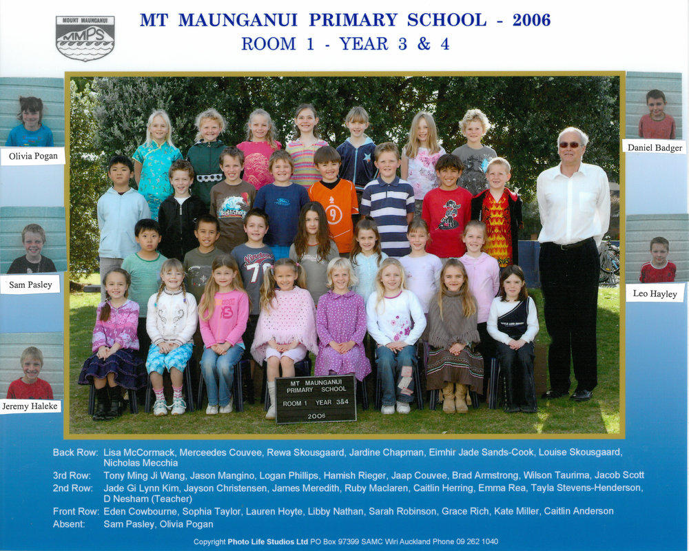 Date2006Reference NumberPhoto 13-439DescriptionPhotograph of Mount Maunganui Primary School Room 1 Year 3 & 4 2006. From images collected during Mount Maunganui Primary School Centenary 2013. Back Row: Lisa McCormack - Merceedes Couvee - Rewa Skousgaard - Jardine Chapman - Eimhir Jade Snads-Cook - Louise Skousgaard - Nicholas Mecchia#rd Row: Tony Ming Ji Wang - Jason Mangino - Logan Phillips - Hamish Rieger - Jaap Couvee - Brad Armstrong - Wilson Taurima - Jacob Scott @nd Row: Jade Gi Lynn Kim - Jayson Christiansen - James Meredith - Ruby Maclaren - Caitlin Herring - Emma Rea - Tayla Stevens-Henderson - D Nesham (Teacher)Front Row: Eden Cowbourne - Sophia Taylor - Lauren Hoyte - Libby Nathan - Sarah Robinson - Grace Rich - Kate Miller - Caitlin AndersonAbsent: Sam Pasley - Olivia PoganPhotograph of Mount Maunganui Primary School Room 1 Year 3 & 4 2006. From images collected during Mount Maunganui Primary School Centenary 2013. Back Row: Lisa McCormack - Merceedes Couvee - Rewa Skousgaard - Jardine Chapman - Eimhir Jade Snads-Cook - Louise Skousgaard - Nicholas Mecchia#rd Row: Tony Ming Ji Wang - Jason Mangino - Logan Phillips - Hamish Rieger - Jaap Couvee - Brad Armstrong - Wilson Taurima - Jacob Scott @nd Row: Jade Gi Lynn Kim - Jayson Christiansen - James Meredith - Ruby Maclaren - Caitlin Herring - Emma Rea - Tayla Stevens-Henderson - D Nesham (Teacher)Front Row: Eden Cowbourne - Sophia Taylor - Lauren Hoyte - Libby Nathan - Sarah Robinson - Grace Rich - Kate Miller - Caitlin AndersonAbsent: Sam Pasley - Olivia PoganFormatPrint