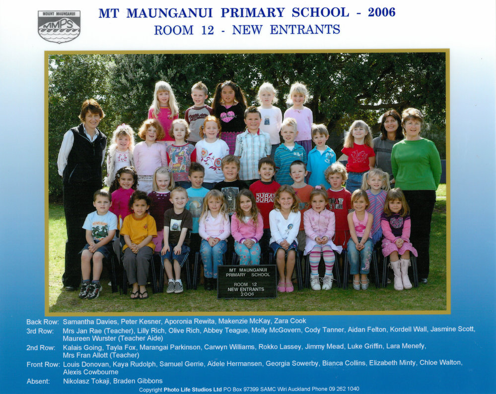 Date2006Reference NumberPhoto 13-487DescriptionPhotograph of Mount Maunganui Primary School Room 12 New Entrants 2006. From images collected during Mount Maunganui Primary School Centenary 2013. Back Row: Samantha Davies - Peter Kesner - Aporonia Rewita - Makenzie McKay - Zara Cook3rd Row: Mrs Jan Rae (Teacher) - Lilly Rich - Olive Rich - Abbey Teague - Molly McGovern - Cody Tanner - Aidan Felton - Kordell Wall - Jasmine Scott - Maureen Wurster (Teacher Aide)2nd Row: Kalais Going - Tayla Fox - Marangai Parkinson - Carwyn Williams - Rokko Lassey - Jimmy Mead - Luke Griffin - Lara Menefy - Mrs Fran Allott (Teacher)Front Row: Louis Donovan - Kaya Rudolph - Samuel Gerrie - Adele Hermansen - Georgia Sowerby - Bianca Collins - Elizabeth Minty - Chloe Walton - Alexis CowbourneAbsent : Nikolasz Tokaji - Braden GibbonsPhotograph of Mount Maunganui Primary School Room 12 New Entrants 2006. From images collected during Mount Maunganui Primary School Centenary 2013. Back Row: Samantha Davies - Peter Kesner - Aporonia Rewita - Makenzie McKay - Zara Cook3rd Row: Mrs Jan Rae (Teacher) - Lilly Rich - Olive Rich - Abbey Teague - Molly McGovern - Cody Tanner - Aidan Felton - Kordell Wall - Jasmine Scott - Maureen Wurster (Teacher Aide)2nd Row: Kalais Going - Tayla Fox - Marangai Parkinson - Carwyn Williams - Rokko Lassey - Jimmy Mead - Luke Griffin - Lara Menefy - Mrs Fran Allott (Teacher)Front Row: Louis Donovan - Kaya Rudolph - Samuel Gerrie - Adele Hermansen - Georgia Sowerby - Bianca Collins - Elizabeth Minty - Chloe Walton - Alexis CowbourneAbsent : Nikolasz Tokaji - Braden GibbonsFormatPrint