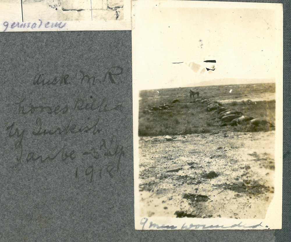 Date1918Reference NumberPhoto 14-0299Description From the family album belonging to veteran Lance Corporal Andrew Patrick Hughes. Dead horse laid out in rows. Handwritten at side is "Auck M. R. horse killed by Turkish Taube - (indecipherable) 1918" and at photo base "9 men wounded". FormatPrintSource of AcquisitionFrank Hughes (Son to Andrew Hughes)