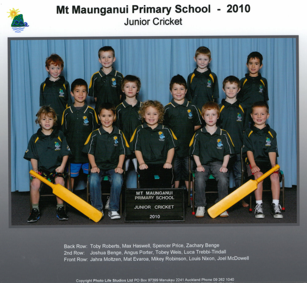 Date2010Reference NumberPhoto 13-1355DescriptionPhotograph of Mount Maunganui Primary School Junior Circket 2010. From images collected during centenary celebrations 2013. Row 3: Toby Roberts – Max Haswell – Spencer Price – Zachary BengeRow 2: Joshua Benge – Angus Porter – Tobey Weis – Luca Trebbi-TindallRow 1: Jahra Moltzen – Mat Evaroa – Mikey Robinson – Louis Nixon – Joel McDowellPhotograph of Mount Maunganui Primary School Junior Circket 2010. From images collected during centenary celebrations 2013. Row 3: Toby Roberts – Max Haswell – Spencer Price – Zachary BengeRow 2: Joshua Benge – Angus Porter – Tobey Weis – Luca Trebbi-TindallRow 1: Jahra Moltzen – Mat Evaroa – Mikey Robinson – Louis Nixon – Joel McDowellFormatPrint