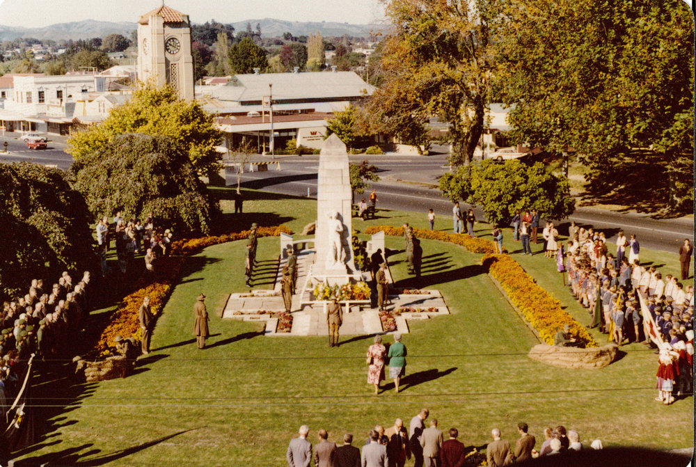 Datec. 1980sReference NumberPhoto 12-723DescriptionThe Cenotaph in Cambridge taken, probably, during ANZAC day during the 1980s. FormatPrintSource of AcquisitionThe 6th Battalion (Hauraki) Regimental Association Inc. History Room Curator, Tony Fraser.
