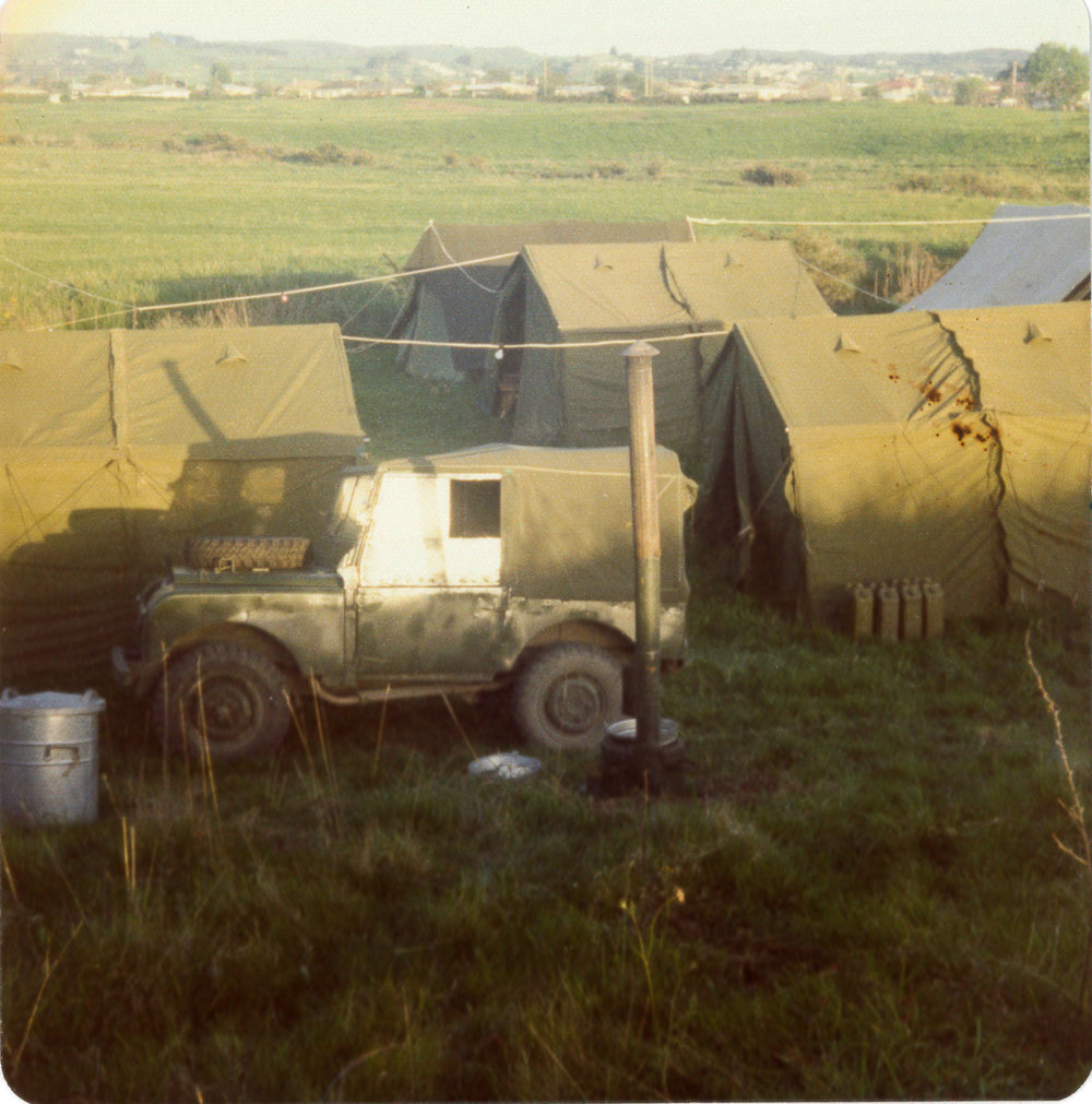Datec. 1970 to c. 1980Reference NumberPhoto 12-737DescriptionJeep among tents. Noted with file CPX in Auckland. Handwritten on reverse 'New 11 X 11 tents Series 1 Landrover (Puddle Jumper) Chuffer for hot water. FormatPrintSource of AcquisitionThe 6th Battalion (Hauraki) Regimental Association Inc. History Room Curator, Tony Fraser.
