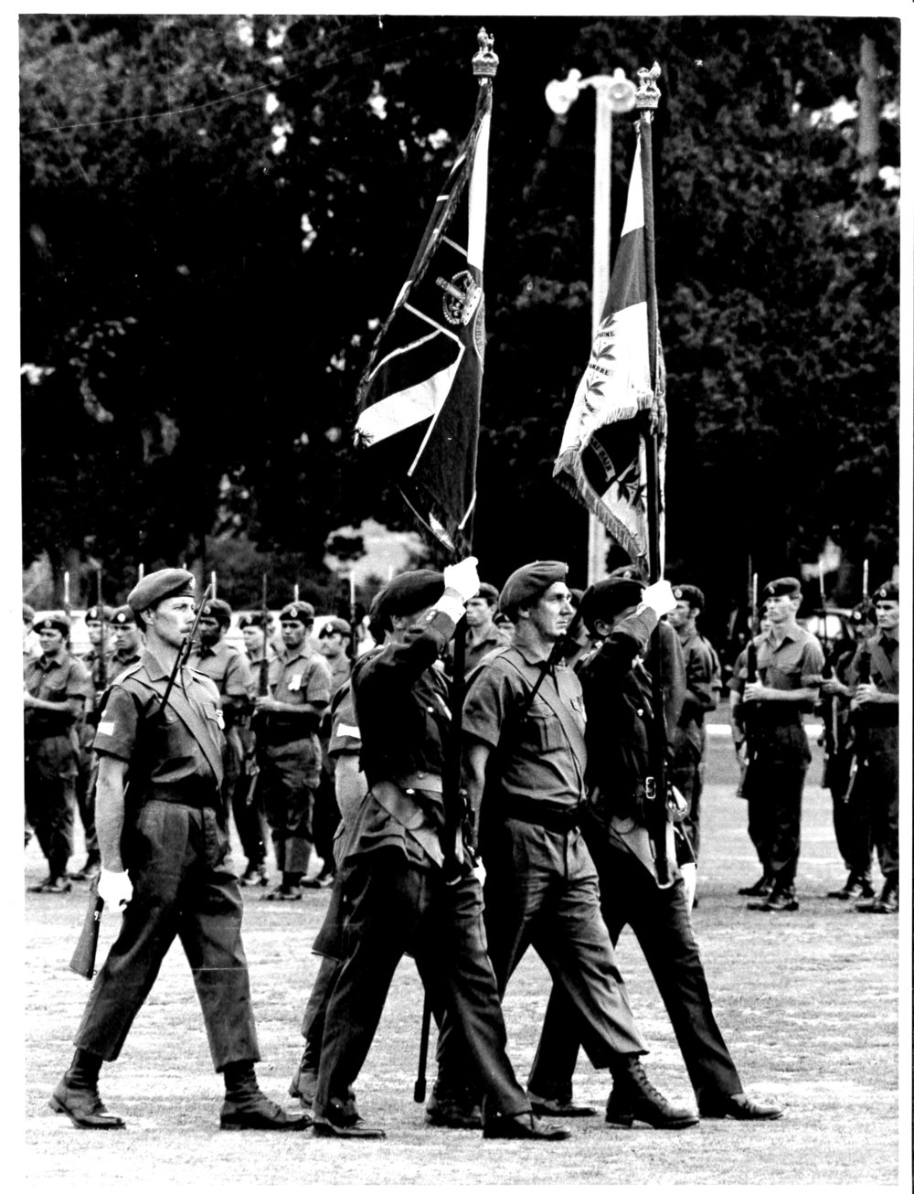 Date1973Reference NumberPhoto 12-751DescriptionPhotograph taken during Colours Parade in Rotorua 1973. Noted with file 'Old Colours Trooped'. Colour escorts SSGT Baz Porter (L) WOII Keith Browning'. 1973.FormatPrintSource of AcquisitionThe 6th Battalion (Hauraki) Regimental Association Inc. History Room Curator, Tony Fraser.