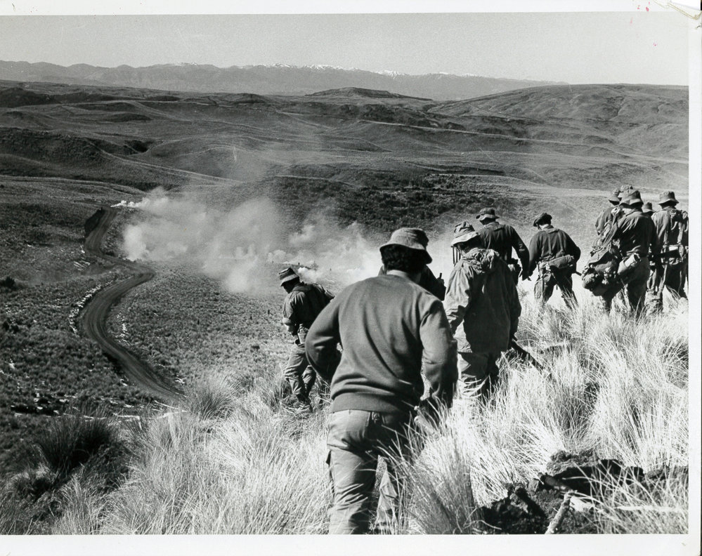 Date1976Reference NumberPhoto 12-762DescriptionSoldiers on hillside in bleak landscape. Handwritten on reverse "Stop the war and put fire out". A. Camp 1976'. FormatPrintSource of AcquisitionThe 6th Battalion (Hauraki) Regimental Association Inc. History Room Curator, Tony Fraser.