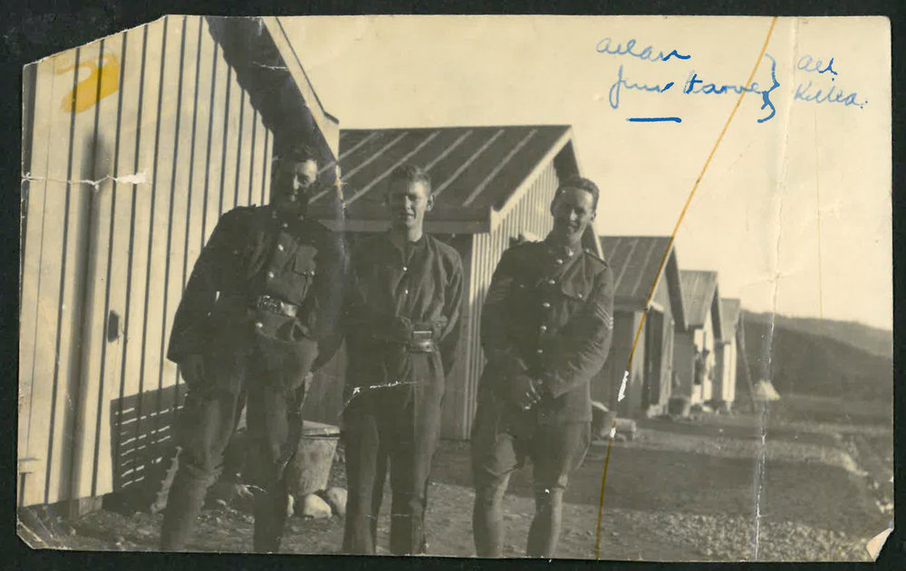 Reference NumberPhoto 14-0327DescriptionWWI three men outside huts Written in ink "Allan Jim Harvey - All Killed". FormatPrintSource of AcquisitionAllan Philip Morpeth