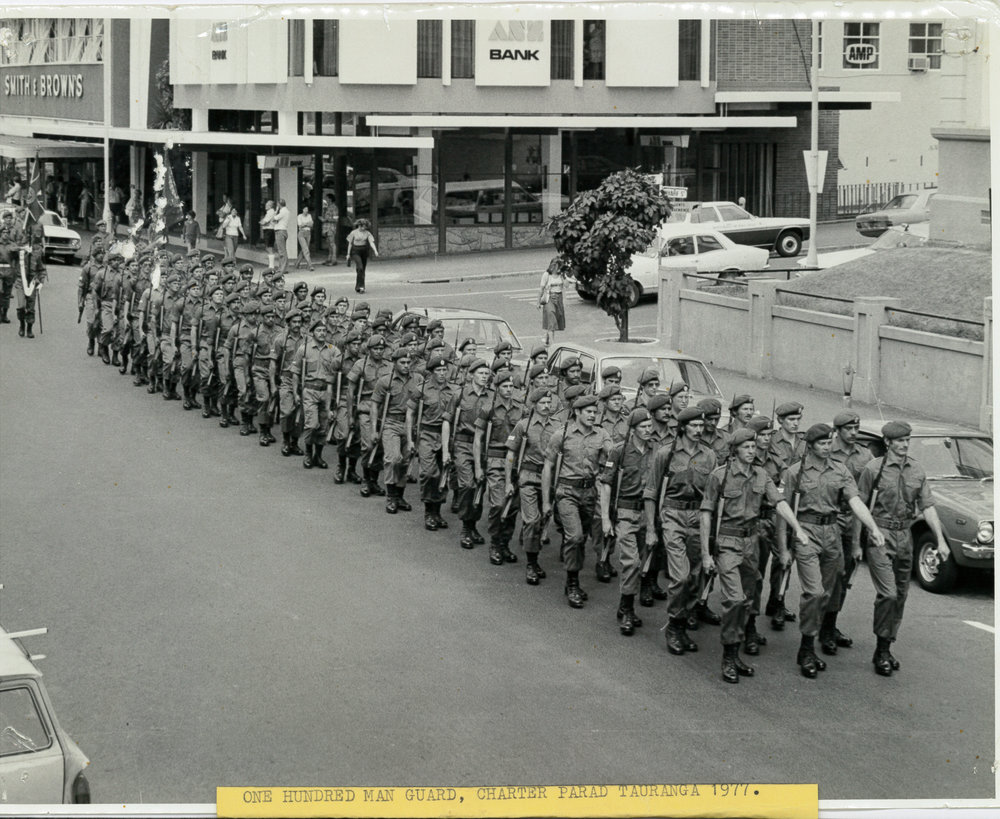 Date1977Reference NumberPhoto 12-764DescriptionSoldiers marching past Tauranga's Old Town Hall and Wharf Street in 1977. ANZ Bank, AMP and Smith & Browns in the background. Noted with file 'One hundred man guard, Charter Parade Tauranga 1977.' FormatPrintSource of AcquisitionThe 6th Battalion (Hauraki) Regimental Association Inc. History Room Curator, Tony Fraser.