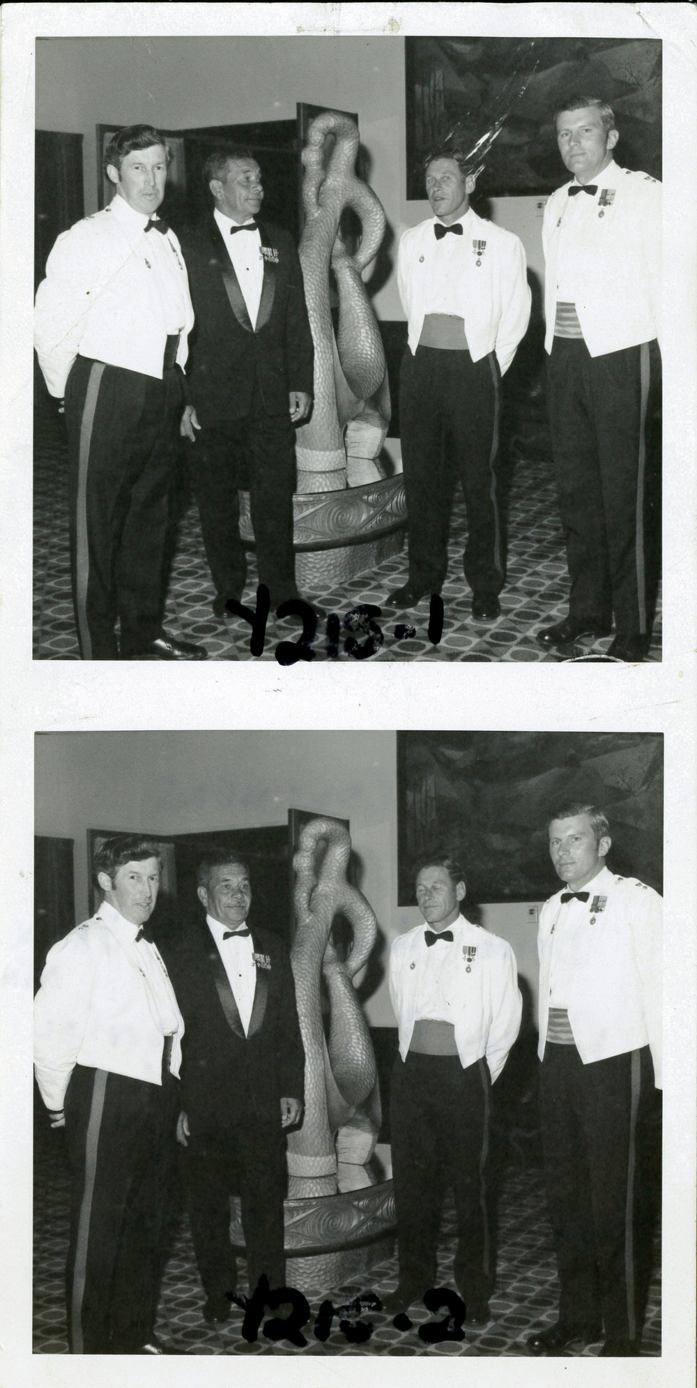 Date1975Reference NumberPhoto 12-770DescriptionFour Colonels at a social function. Handwritten on reverse '4 Colonels L-R Dan Harris CO 3 Auck Nth, Aubrey Balzer Hon Col 6 Hau, Stewart Foster incoming 6 Hau, Evan Torrance, outgoing, CO 6 Hau. Dinner 1975'. FormatPrintSource of AcquisitionThe 6th Battalion (Hauraki) Regimental Association Inc. History Room Curator, Tony Fraser.