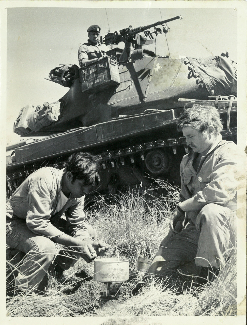Date1977Reference NumberPhoto 12-773DescriptionTwo soldiers crouch over a billy with a tank in background. Noted with file 'Tea break. In background an M41 Light Tank. Annual camp 1977 at Waiouru'. FormatPrintSource of AcquisitionThe 6th Battalion (Hauraki) Regimental Association Inc. History Room Curator, Tony Fraser.