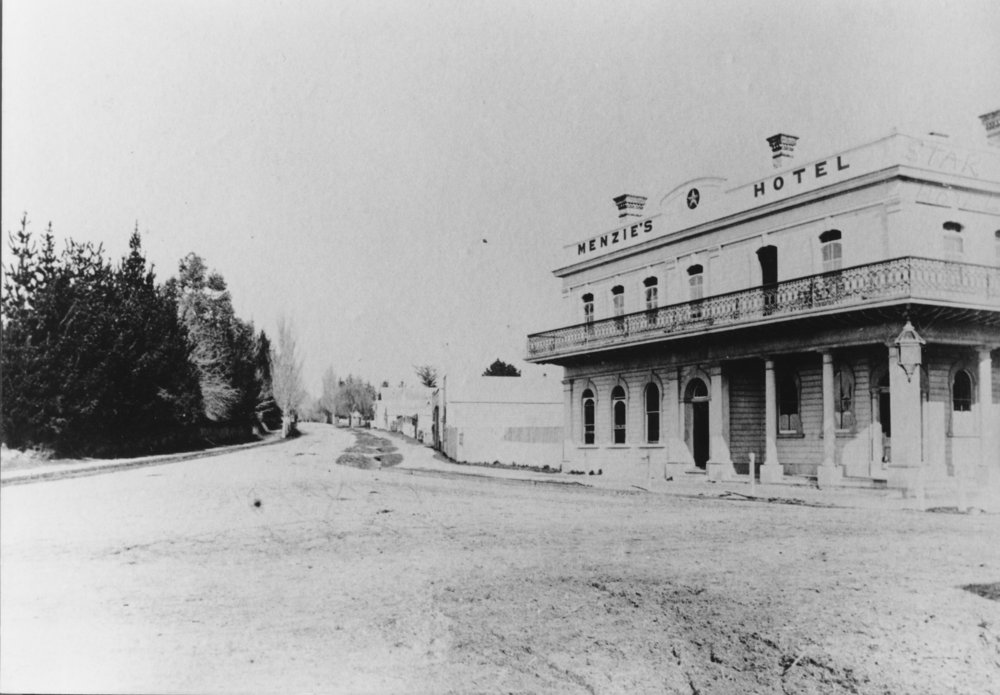 DateAfter 1887Reference NumberPhoto 00-182Description Star Hotel, corner of Devonport Road and Spring Street, Tauranga, while under the ownership of Menzies after 1887. Photo looking south up Devonport Road.FormatPrintPhysical Descriptionblack and white print