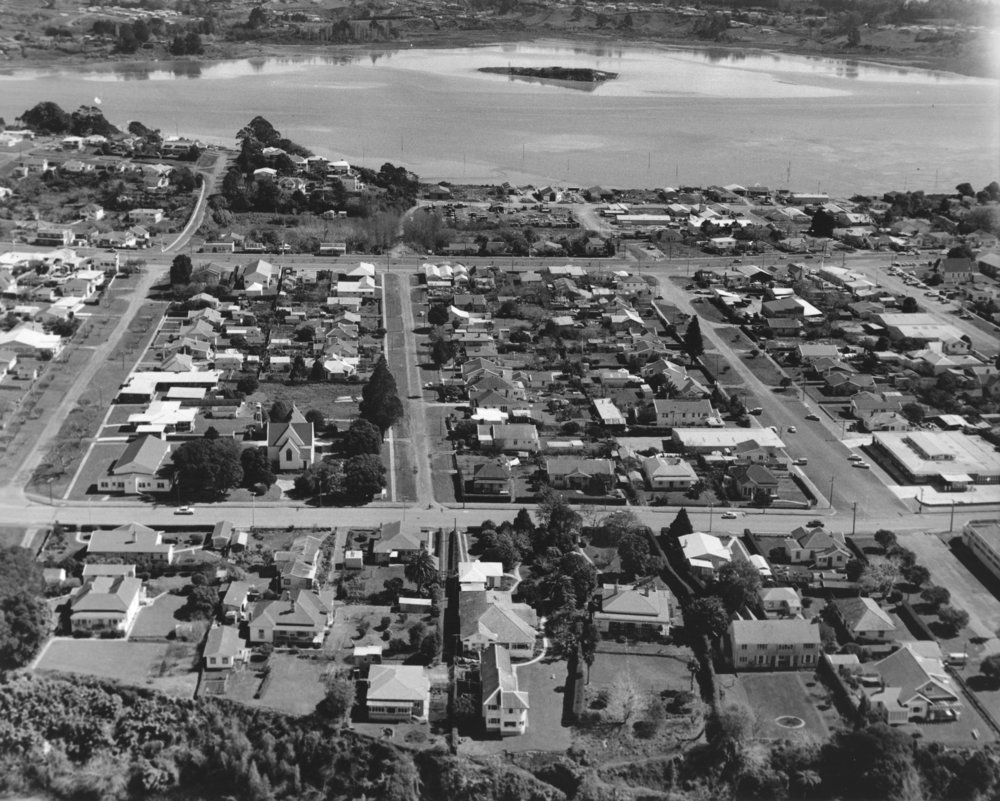 Datec. 1962Reference NumberPhoto 00-218Description Aerial view of Tauranga between 2nd and 4th Avenues, Devonport Road and Cameron Road. Shows Holy Trinity Church, 1962.FormatPrintPhysical Descriptionblack and white printPhotographer/CreatorCarters Photo Service Tauranga