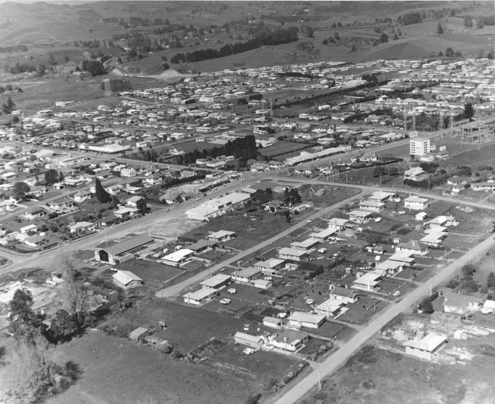 Datec. 1960 to c. 1970Reference NumberPhoto 00-238Description Aerial view of Greerton shopping area. Cameron Road bottom left to top right. Chadwick Road left to right across centre. Shows Greerton School c. 1960sFormatPrintPhysical Descriptionblack and white printPhotographer/CreatorCarters Photo Service Tauranga