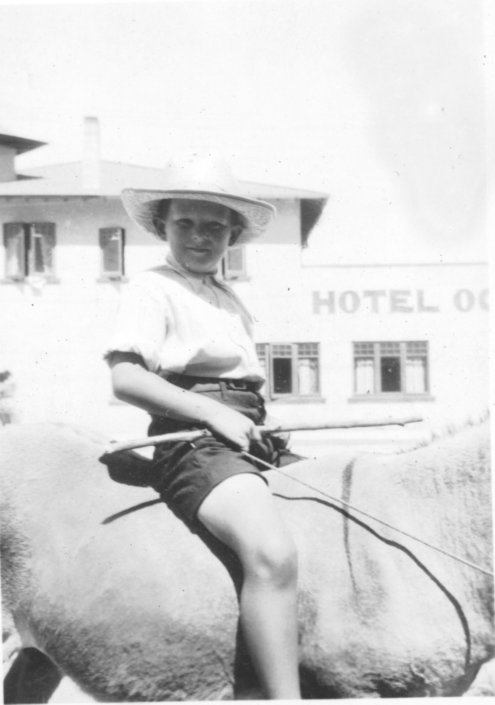 Date1940Reference NumberPhoto 00-248DescriptionClive Watkins son of Viv Watkins on a donkey at Mount Maunganui. Hotel Oceanside in background 1940.FormatPrintPhysical Descriptionblack and white print