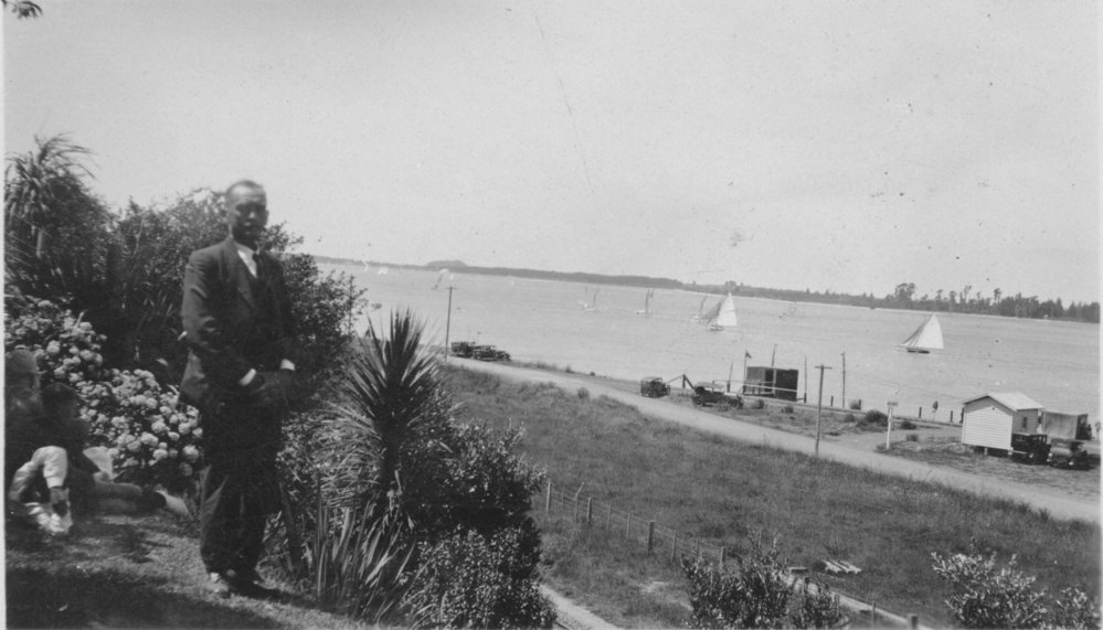 Date1931Reference NumberPhoto 00-461DescriptionMan on Monmouth Redoubt, yachts on Tauranga Harbour, Regatta Day 1931.FormatPrintPhysical Descriptionblack and white print