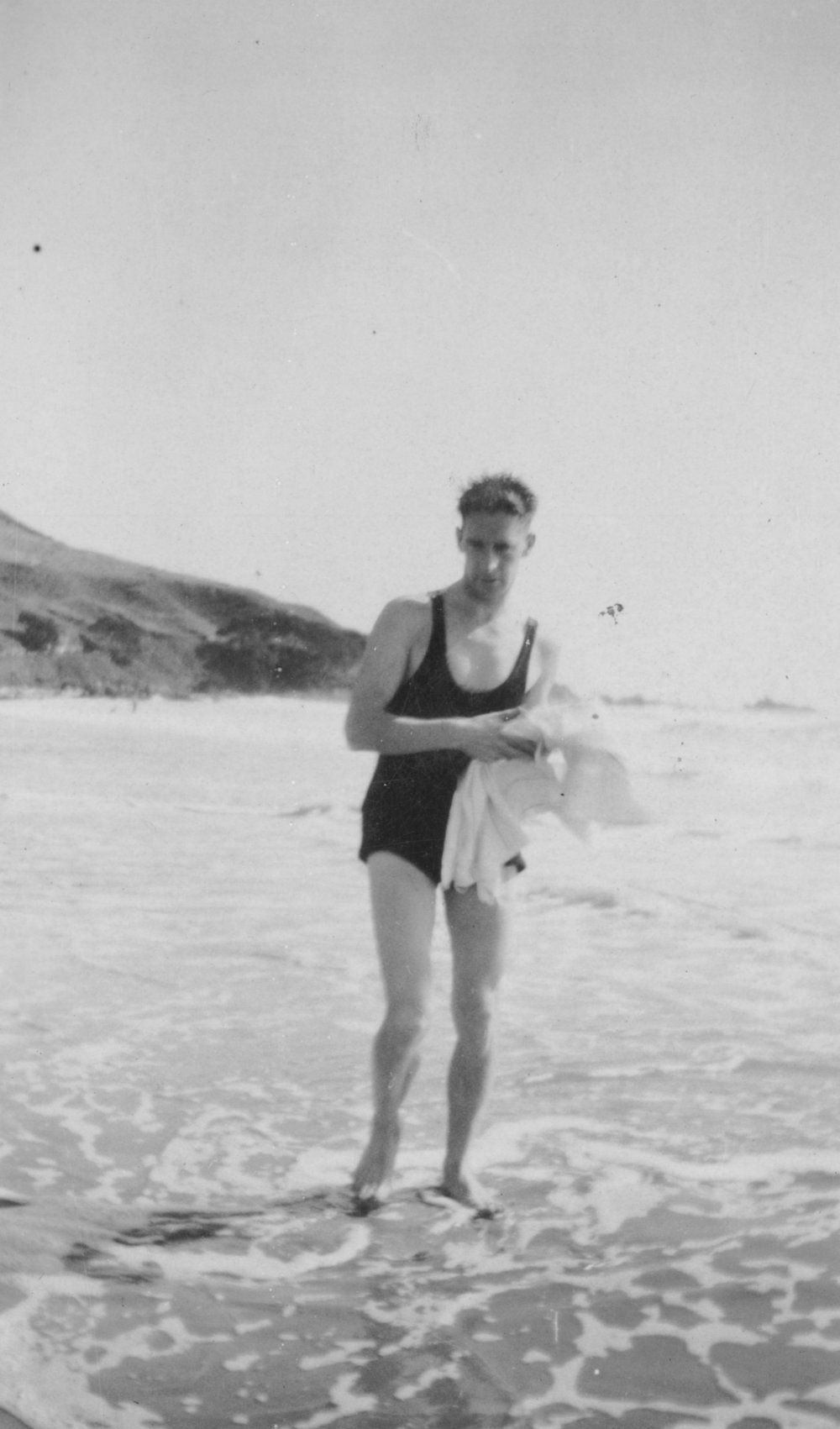 Datec. 1931Reference NumberPhoto 00-463DescriptionUnknown man in bathing suit on Ocean Beach, Mount Maunganui, c. 1931.FormatPrintPhysical Descriptionblack and white print