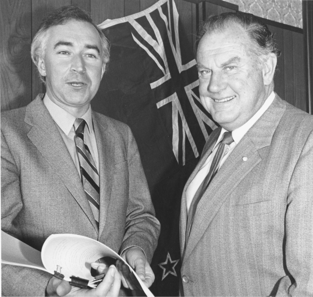 Datec. 1982Reference NumberPhoto 00-479Description Roger McLay left and the National Party MP for Tauranga, Keith Allen c. 1982.FormatPrintPhysical Descriptionblack and white printPhotographer/CreatorBay of Plenty Times