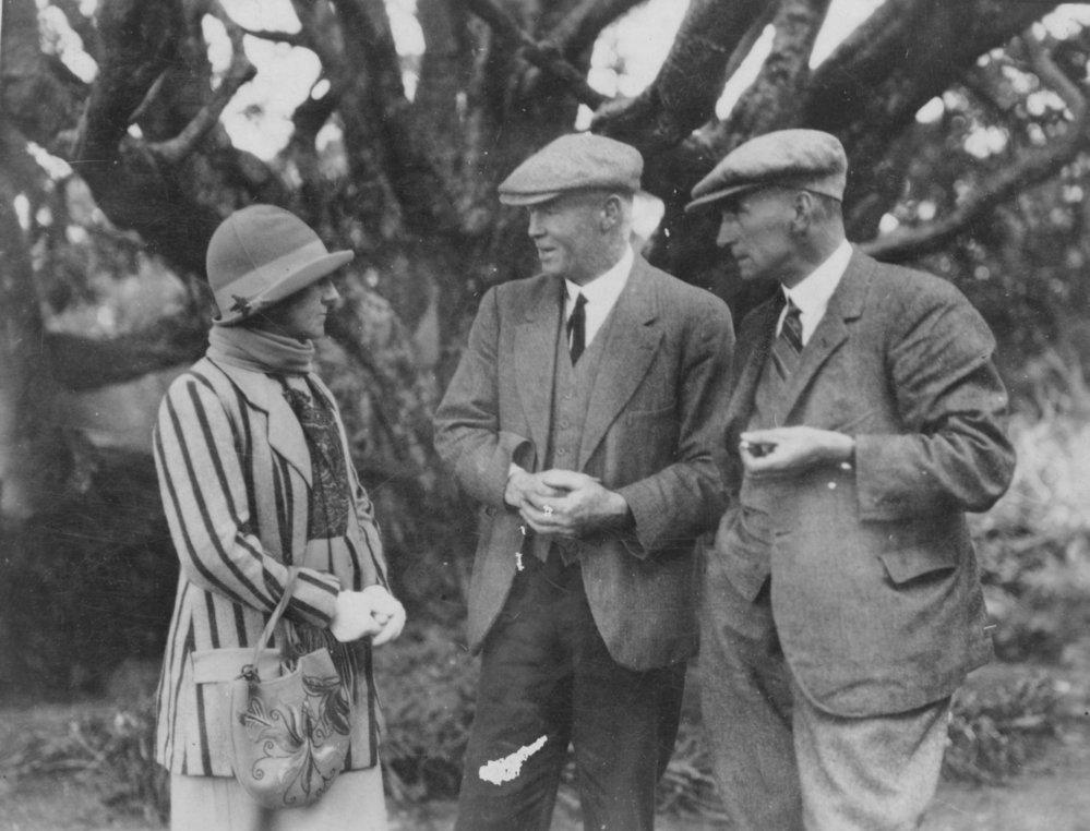 DateSeptember or October 1925Reference NumberPhoto 00-491DescriptionUnder the western side of the tītoki tree, Matheson farm, Ōtūmoetai, Alister Matheson senior (centre) probably telling Dr and Mrs Bertram of Rotorua about the history of the site. Photo by Neville Souter of Cambridge during Hunt Week Sept-Oct 1925.FormatPrintPhysical Descriptionblack and white printPhotographer/CreatorSouter, Neville Reid, 1898-1976