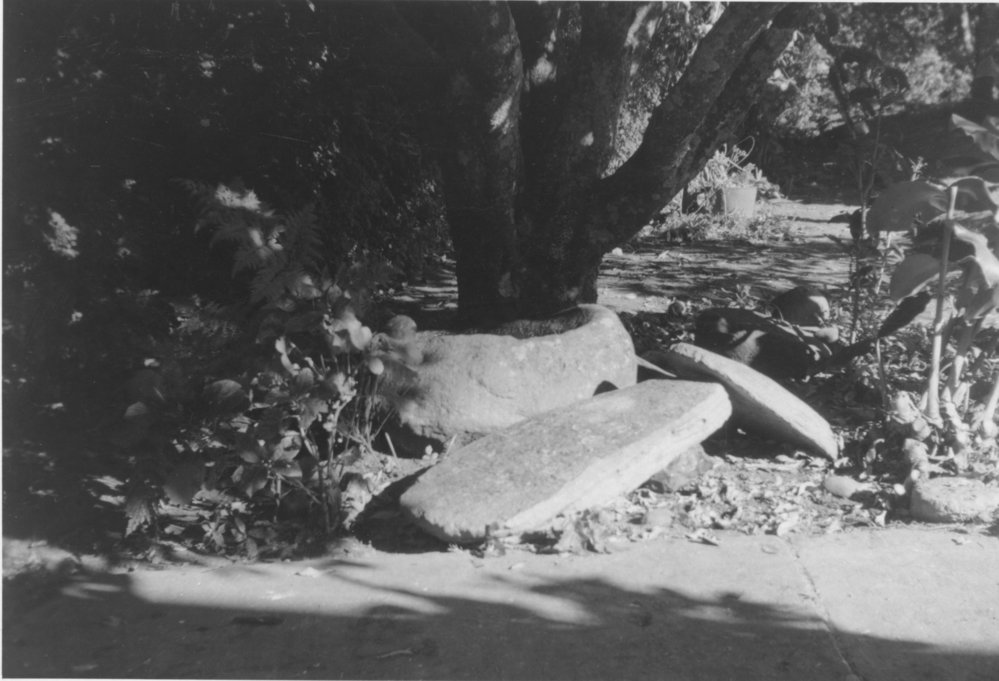 DateEarly 1970sReference NumberPhoto 00-493DescriptionThe two remaining slabs of the Peace Stone in front of the font or Holy Water stoop from the old Ōtūmoetai Catholic Mission Church (now at Te Puna Church) early 1970s. The larger stone is 94 cm long, 42.5 wide and 14 deep. J.P.Porter, a civil engineer, reckoned that the stone was of rhyolite, probably from the Blowhole area, Mount Maunganui.FormatPrintPhysical Descriptionblack and white print