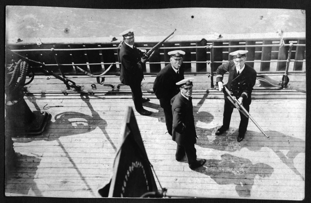 Date1918 or 1919Reference NumberPhoto 14-0415DescriptionA page of images from an album that originally belonged Herbert (Bertie) Henry Glasspool (R. N. V. R). Photographs taken aboard the Partridge II in or around the Island of Malta. Officers with rifles, Glasspool at right. 1918 or 1919FormatPrintSource of Acquisition Graham O'Riordan (Grandson to Herbert 'Bertie' Henry Glasspool)