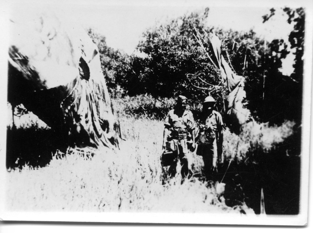 Date1939-1945Reference NumberPhoto 14-0646DescriptionUnknown whether this was taken by Allied soldiers or given by German prisoners of war in Africa after the fall of Tunis. 2 men in bush. FormatPrintSource of AcquisitionCheryl White (niece to Ian Lowman)