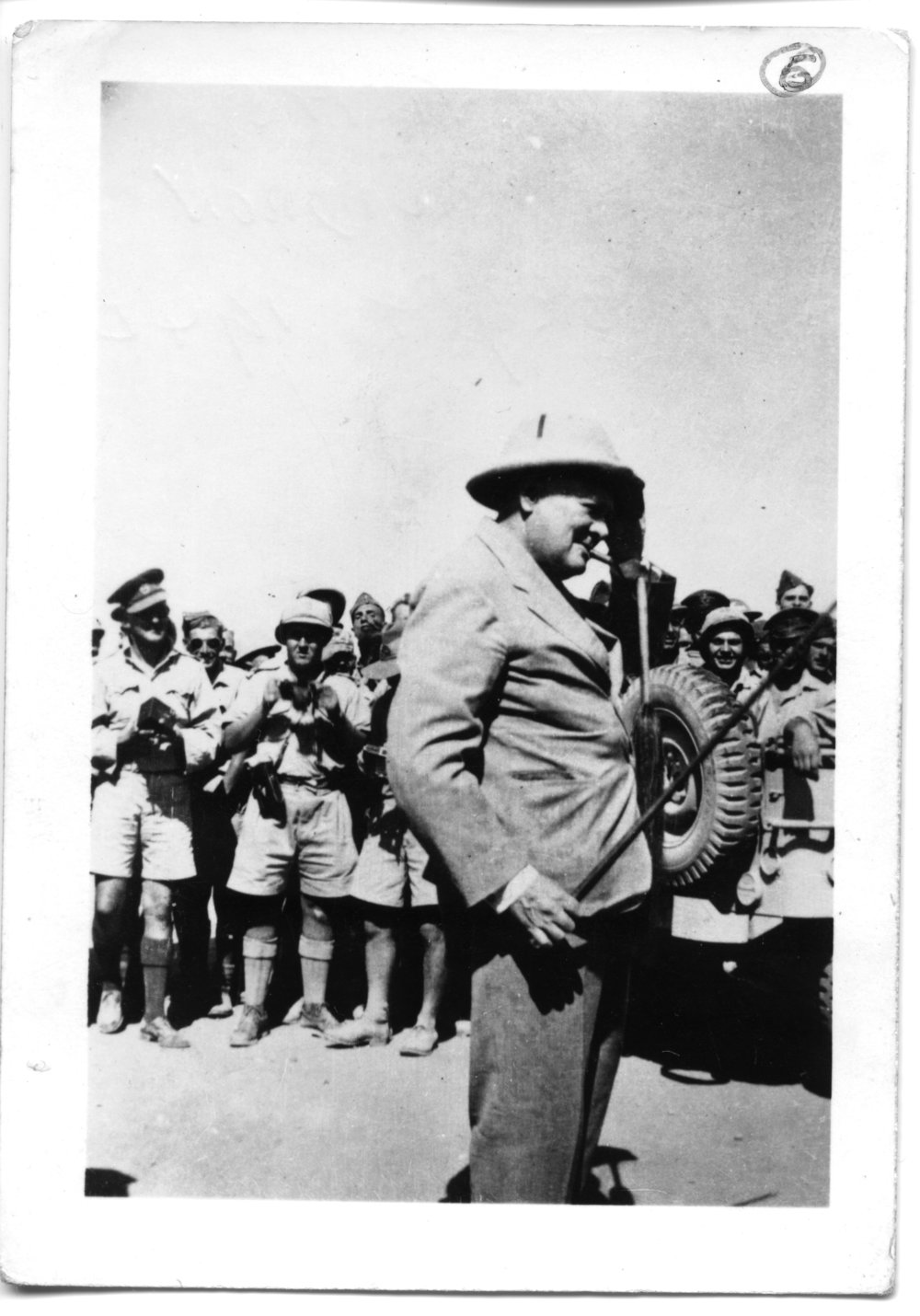 Date1942Reference NumberPhoto 15-103DescriptionScanned Winston Churchill. Handwritten on reverse "Winston visits our squadron in Egypt 1942". FormatPrintSource of AcquisitionPeter Pratt (Brother to James Pratt)