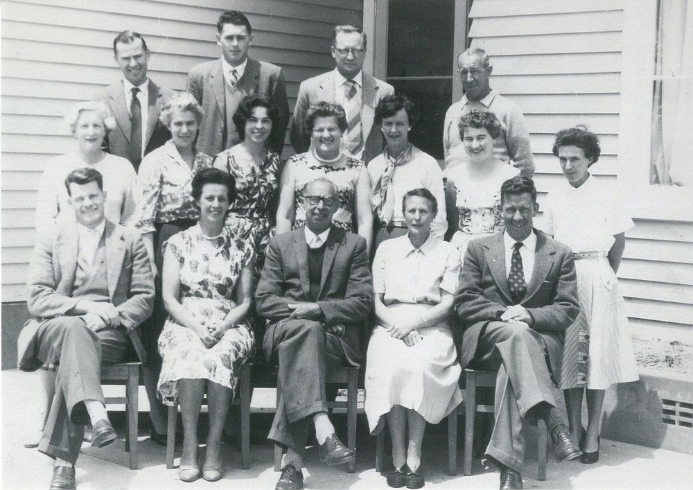 Date1960Reference NumberPhoto 13-898DescriptionMount Maunganui Primary School staff 1960. From images collected during centenary celebrations 2013. Row 3: Mr G Hawkins – Mr Ted Fuller – Mr H Baker – Mr Rossiter Row 2: Mrs M Hughes – Mrs Davies – Mrs F Best – Mrs F Kendall – Mrs B Paton – Miss H Muggeridge – Mrs B Hughan Row 1 Mr R Brickell -Mrs B Gordon - Mr J Donald – Miss Gwilliam – Mr G B Rown FormatPrint