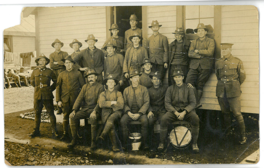 Reference NumberPhoto 15-180DescriptionInformal group photo of men during te Forst World War. William D Gillanders is standing centre row, fourth from left. Handwritten on reverse "To the house. Bill. " Te kūiti man William Duncan Gillanders was born in 1894. He served in Palestine after signing up when his brother was killed at Gallipoli. He was wounded, and made deaf by the wound. William died in 1958 at the age of 64 (reg. 1958/25975)FormatPrintSource of AcquisitionKathleen Gillanders (Daughter to William Gillanders)