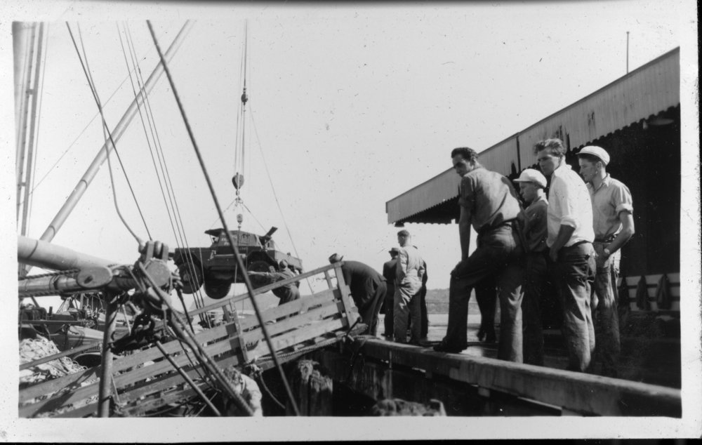 Date1940sReference NumberPhoto 14-0425DescriptionPhotograph from an album belonging to Fred Johnston who, in the later part of the Second World War, was in the pacific islands in a support role. Jeep being loaded onto Mamaku in port. FormatPrint