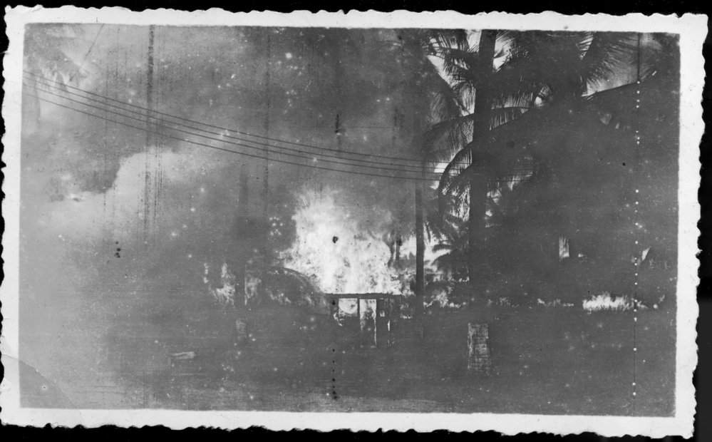 Reference NumberPhoto 14-0431DescriptionPhotograph from an album belonging to Fred Johnston who, in the later part of the Second World War, was in the pacific islands in a support role. Handwritten on reverse "Burning Mess hut Segond Seaplane Base Santos"FormatPrint