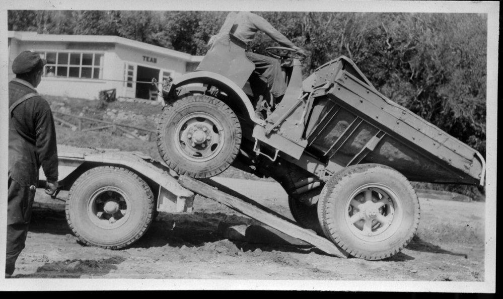 Reference NumberPhoto 14-0444DescriptionPhotograph from an album belonging to Fred Johnston who, in the later part of the Second World War, was in the pacific islands in a support role. Handwritten on reverse "Dump Wagon Kaimai Summit"FormatPrint