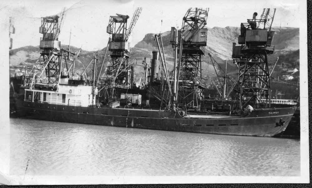 Reference NumberPhoto 14-0467DescriptionPhotograph from an album belonging to Fred Johnson who, in the later part of the Second World War, was in the pacific islands in a support role. He worked on Aircraft engines during WWII in New Zealand and the Pacific (1945 and 1946). Tainui (I) in port. Tainui was built in 1959. For more details see http://www. nzcoastalshipping.com/Northern%20S.S.Co.html FormatPrint