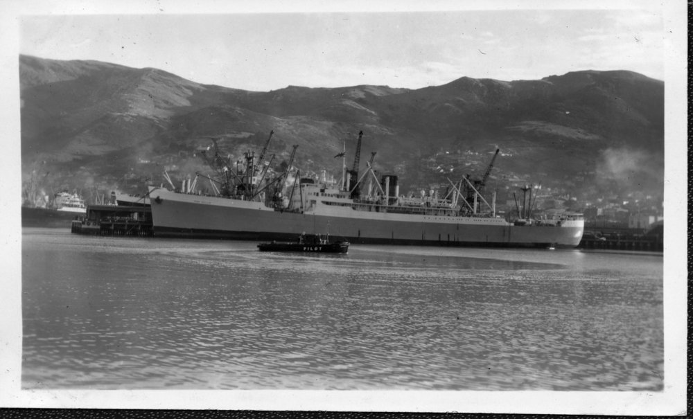 Reference NumberPhoto 14-0470DescriptionPhotograph from an album belonging to Fred Johnson who, in the later part of the Second World War, was in the pacific islands in a support role. He worked on Aircraft engines during WWII in New Zealand and the Pacific (1945 and 1946). Steamship ship Port Phillip in harbour (Lyttleton?). FormatPrint