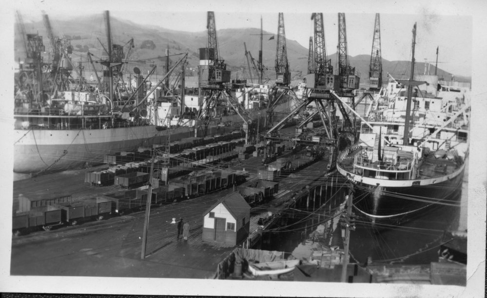 Reference NumberPhoto 14-0473DescriptionPhotograph from an album belonging to Fred Johnson who, in the later part of the Second World War, was in the pacific islands in a support role. He worked on Aircraft engines during WWII in New Zealand and the Pacific (1945 and 1946). Handwritten on reverse "Lyttleton Wharf". FormatPrint