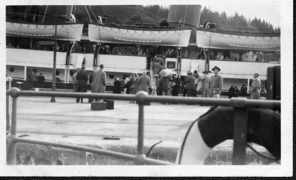 Reference NumberPhoto 14-0481DescriptionPhotograph from an album belonging to Fred Johnson who, in the later part of the Second World War, was in the pacific islands in a support role. He worked on Aircraft engines during WWII in New Zealand and the Pacific (1945 and 1946). Passengers boarding a steam ship. FormatPrint