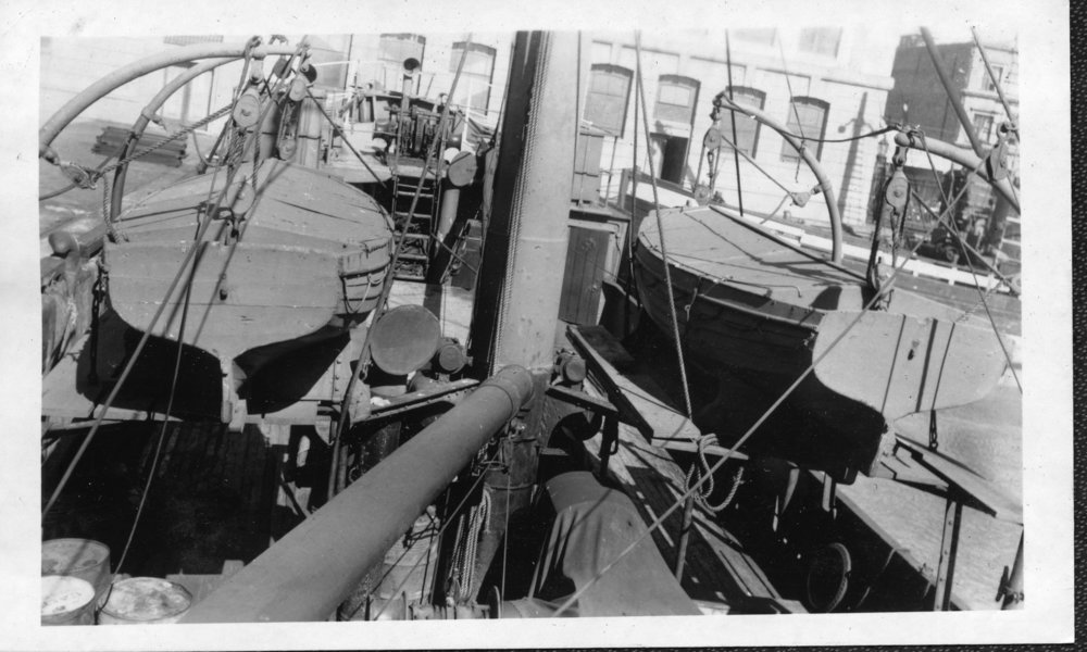Reference NumberPhoto 14-0483DescriptionPhotograph from an album belonging to Fred Johnson who, in the later part of the Second World War, was in the pacific islands in a support role. He worked on Aircraft engines during WWII in New Zealand and the Pacific (1945 and 1946). Life rafts and rigging. Probably the Ranginui, a refrigerated transport between Auckland and Wangarei. FormatPrint