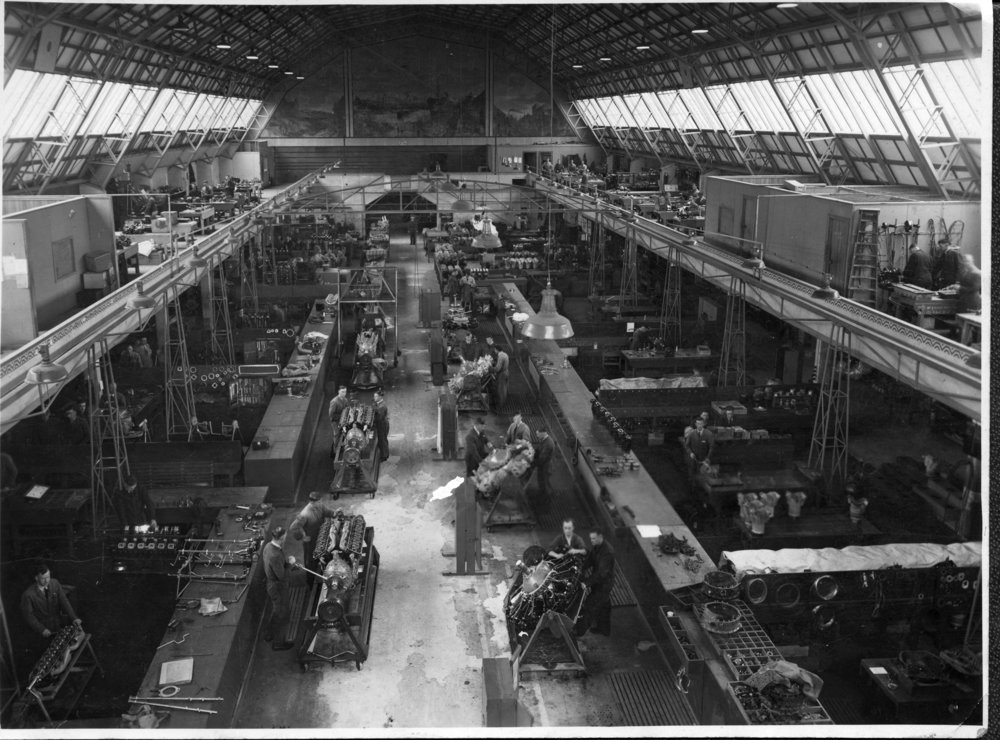 Reference NumberPhoto 14-0486DescriptionPhotograph from an album belonging to Fred Johnson who, in the later part of the Second World War, was in the pacific islands in a support role. He worked on Aircraft engines during WWII in New Zealand and the Pacific (1945 and 1946). Handwritten on reverse "Bledeslo hall. Waikato Winter Show. ERS RNZAF. Engine assembly lines". Stamped on reverse "RNZAF Official Photograph Not For Publication". D. P. R. Grading D for general release". FormatPrint