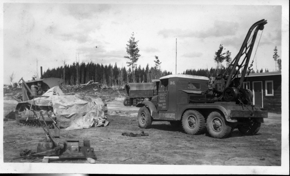Reference NumberPhoto 14-0491DescriptionPhotograph from an album belonging to Fred Johnson who, in the later part of the Second World War, was in the pacific islands in a support role. He worked on Aircraft engines during WWII in New Zealand and the Pacific (1945 and 1946). Construction equipment in forestry settings. Truck has on door "F. Butler. Ward Street. Hamilton. Allis Chalmers". FormatPrint