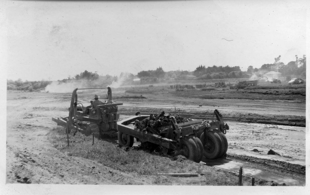 Date1950sReference NumberPhoto 14-0496DescriptionPhotograph from an album belonging to Fred Johnson who, in the later part of the Second World War, was in the pacific islands in a support role. He worked on Aircraft engines during WWII in New Zealand and the Pacific (1945 and 1946). Road construction equipment. c 1950s. Probably taken in Hamilton, perhaps near the university. FormatPrint