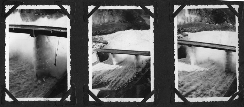 Date1940sReference NumberPhoto 14-0508DescriptionPhotograph from an album belonging to Fred Johnson who, in the later part of the Second World War, was in the pacific islands in a support role. He worked on Aircraft engines during WWII in New Zealand and the Pacific (1945 and 1946). Photographs of the first bridge with it's supporting column in the centre which was destroyed by the water running through the spillway . The replacement bridge has no supporting column. Taken in the 1940s. Although begun in 1940 the dam wasn't finished until 1947. FormatPrint