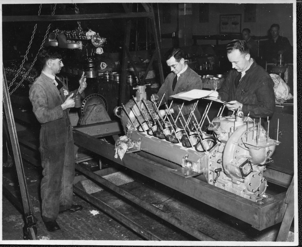 Reference NumberPhoto 14-0519DescriptionPhotograph from an album belonging to Fred Johnson who, in the later part of the Second World War, was in the pacific islands in a support role. He worked on Aircraft engines during WWII in New Zealand and the Pacific (1945 and 1946). Handwritten on reverse Alson Engine assemble line. Bledislo Hall. ERS RNZAF. Johnson F H". Stamped on reverse "Official Photograph Not For Publication". FormatPrint