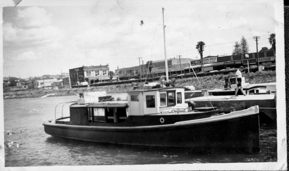 Reference NumberPhoto 14-0569DescriptionPhotograph from an album belonging to Fred Johnson who, in the later part of the Second World War, was in the pacific islands in a support role. He worked on Aircraft engines during WWII in New Zealand and the Pacific (1945 and 1946). Faulkner's Ferry with Strand shops in background. Visible signage include "K. D. Pace Watchmaker - Zeszke - W. J. Stevens Bookseller Stationery - Adams Bruce Rich Cake". Handwritten on reverse "Faulkner's Rere Moana". FormatPrint