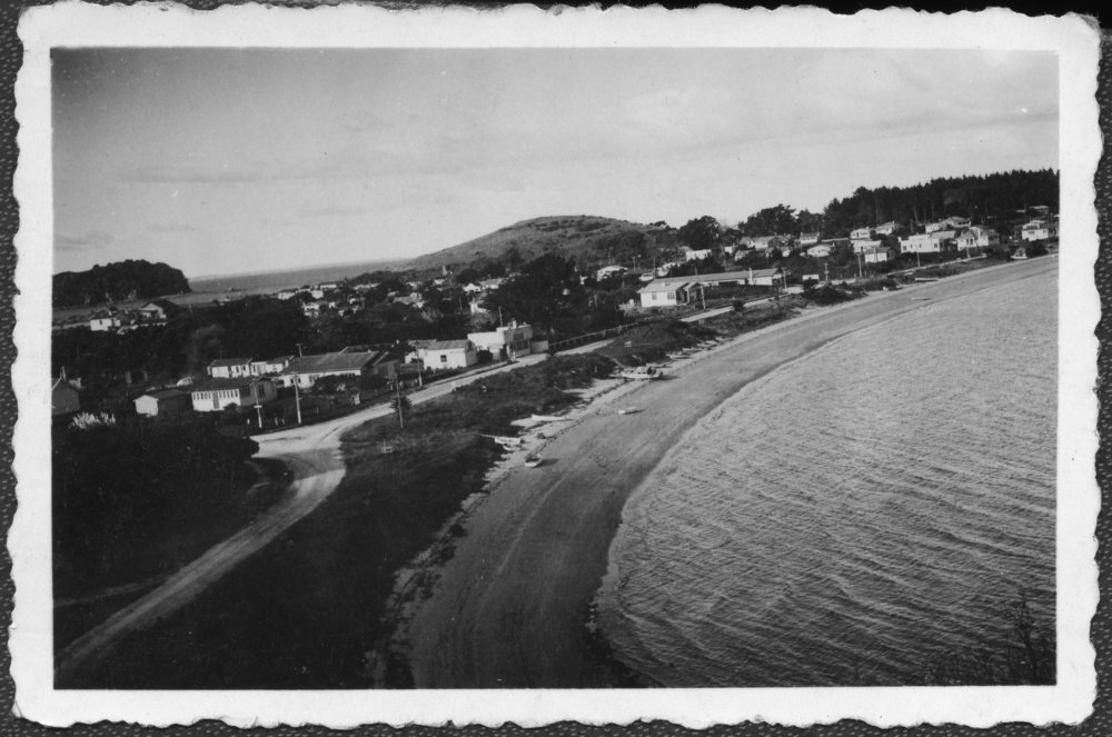 Date1940sReference NumberPhoto 14-0585DescriptionPhotograph from an album belonging to Fred Johnson who, in the later part of the Second World War, was in the pacific islands in a support role. He worked on Aircraft engines during WWII in New Zealand and the Pacific (1945 and 1946). Pilot Bay from part way up Mauao, c. 1940sFormatPrint