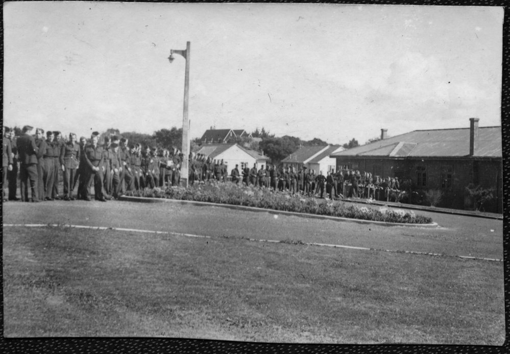 Datec. 1946Reference NumberPhoto 14-0598DescriptionPhotograph from an album belonging to Fred Johnson who, in the later part of the Second World War, was in the pacific islands in a support role. He worked on Aircraft engines during WWII in New Zealand and the Pacific (1945 and 1946). Small thumbnail soldiers assembled informally. Handwritten on reverse "Hobsonville". c 1946FormatPrint