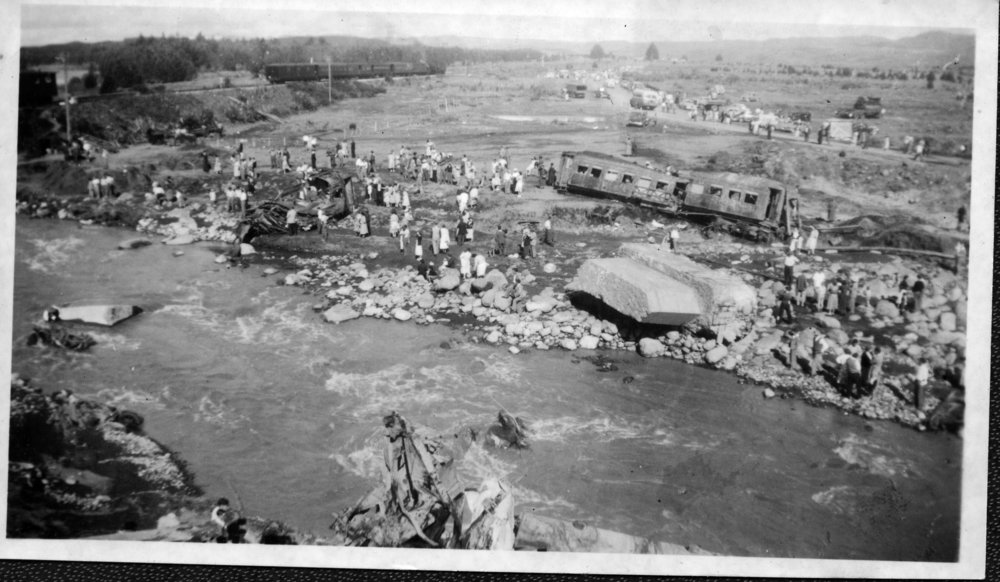 DateDecember 1953Reference NumberPhoto 15-070DescriptionPhotograph from an album belonging to Fred Johnson who, in the later part of the Second World War, was in the pacific islands in a support role. He worked on Aircraft engines during WWII in New Zealand and the Pacific (1945 and 1946). Handwritten on reverse "Tangiwai Rail Disaster. Xmas 1953". FormatPrint