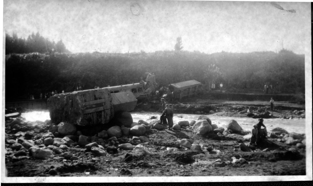 DateDecember 1953Reference NumberPhoto 15-075DescriptionPhotograph from an album belonging to Fred Johnson who, in the later part of the Second World War, was in the pacific islands in a support role. He worked on Aircraft engines during WWII in New Zealand and the Pacific (1945 and 1946). Collapsed bridge wreckage at Tangiwai 1953. Handwritten on reverse "Tangiwai Rail Disaster. Xmas 1953". FormatPrint