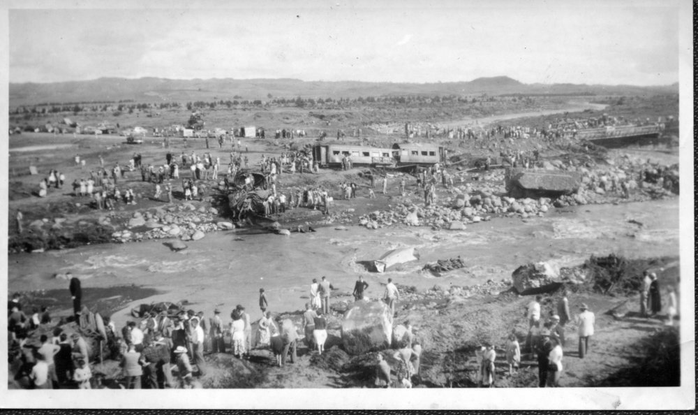 DateDecember 1953Reference NumberPhoto 15-080DescriptionPhotograph from an album belonging to Fred Johnson who, in the later part of the Second World War, was in the pacific islands in a support role. He worked on Aircraft engines during WWII in New Zealand and the Pacific (1945 and 1946). Handwritten on reverse "Tangiwai Rail Disaster. Xmas 1953". FormatPrint