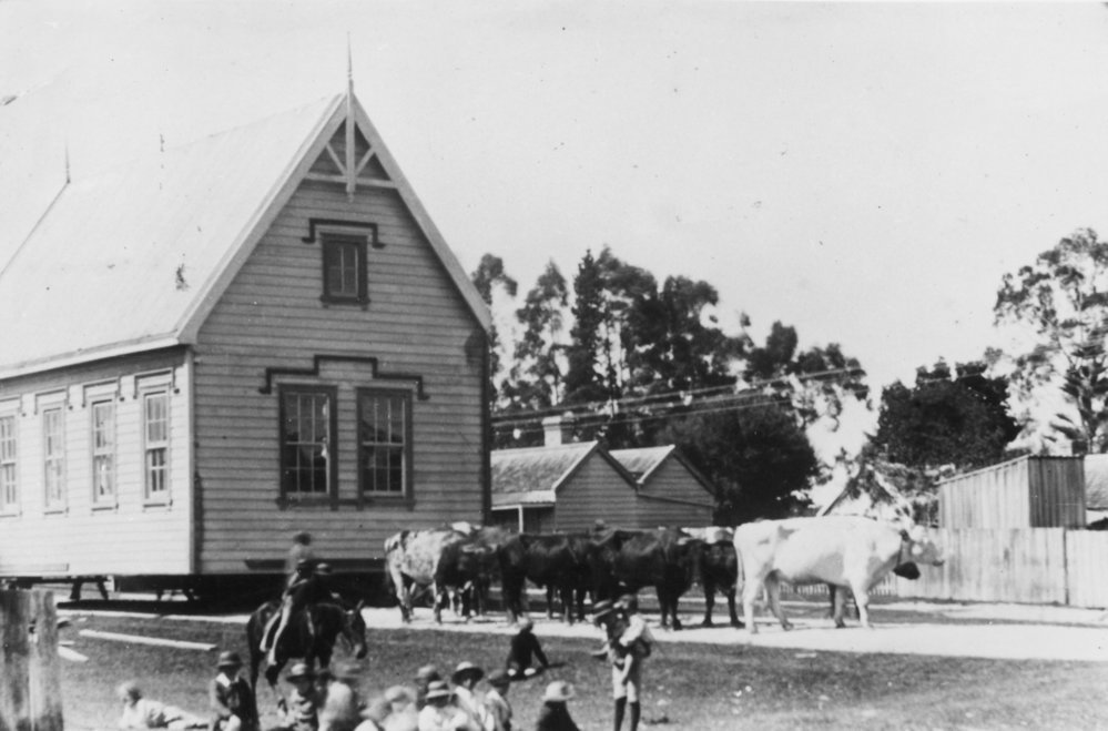 Date1904Reference NumberPhoto 04-111DescriptionTauranga Primary School being moved down Cameron Road by a team of bullocks in 1904.FormatPrintPhysical Descriptionblack and white print